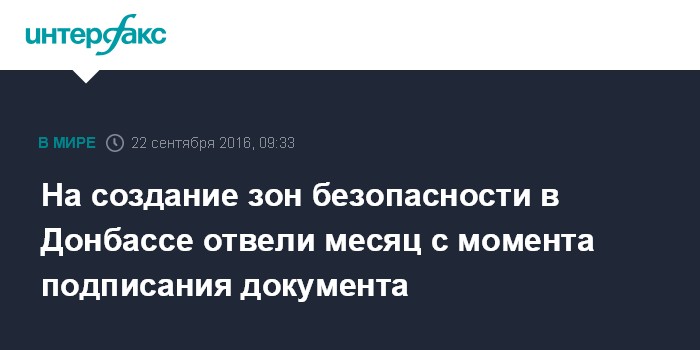 Москва. 22 сентября. INTERFAX.RU - Стороны конфликта в Донбассе обязаны развести подразделения в трех зонах безопасности не позднее чем через месяц после полного подписания рамочного документа, сообщил "Интерфаксу" источник в подгруппе по безопасности Контактной группы по урегулированию на востоке Украины.