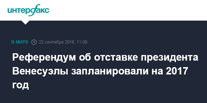 Москва. 22 сентября. INTERFAX.RU - Референдум о досрочном прекращении полномочий президента Венесуэлы Николаса Мадуро может состояться в начале 2017 года, говорится в заявлении Национальной избирательной комиссии.