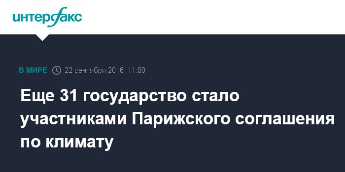 Москва. 22 сентября. INTERFAX.RU - Представители 31 государства накануне в штаб-квартире ООН в Нью-Йорке передали генеральному секретарю Пан Ги Муну ратификационные грамоты к Парижскому соглашению по климату и другие документы о присоединении.
