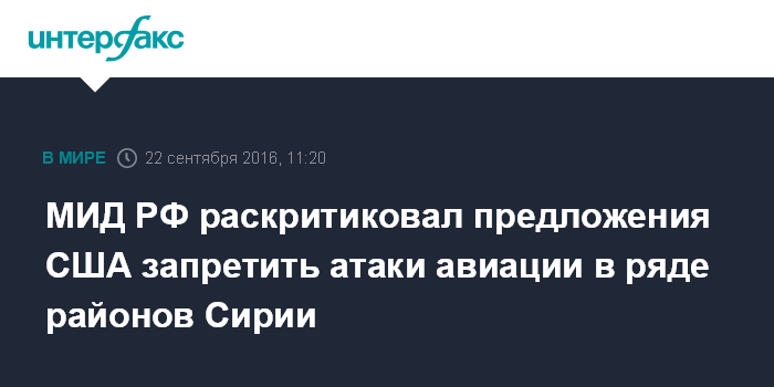 Москва. 22 сентября. INTERFAX.RU - Российская сторона считает неработоспособными предложения США о запрете действий всей авиации в отдельных районах Сирии, заявил в четверг замглавы МИД РФ Сергей Рябков.