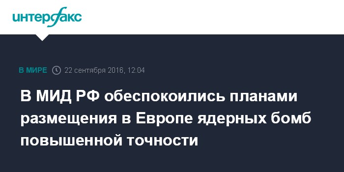 Москва. 22 сентября. INTERFAX.RU - В МИД РФ выразили беспокойство планами США разместить в Европе новые ядерные бомбы повышенной точности.