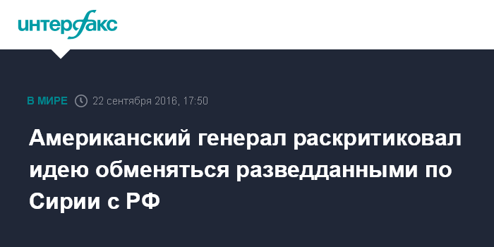 Москва. 22 сентября. INTERFAX.RU - Обмен разведывательной информацией с Россией по Сирии не является хорошей идеей, заявил в четверг председатель Комитета начальников штабов вооруженных сил США генерал Джозеф Данфорд.