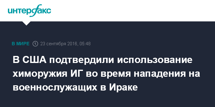 Москва. 23 сентября. INTERFAX.RU - Ракета, запущенная запрещенной в РФ террористической организацией "Исламское государство" в американские войска, базирующиеся в Ираке, действительно содержала иприт, сообщает BBC.