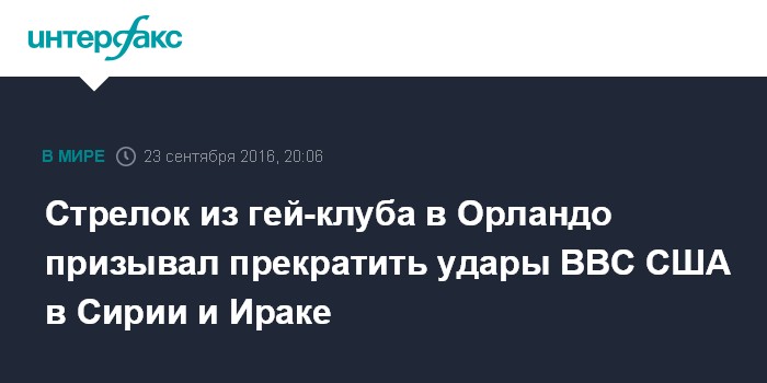 Москва. 23 сентября. INTERFAX.RU - Устроивший массовый расстрел посетителей гей-клуба в американском городе Орландо Омар Матин призывал США прекратить удары по Сирии и Ираку, сообщили в пятницу местные СМИ