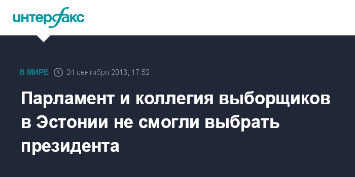 Москва. 24 сентября. INTERFAX.RU - Прошедшие в Эстонии в субботу выборы президента завершились безрезультатно - в ходе второго тура голосования ни один из двух претендентов не смог набрать более половины голосов членов коллегии выборщиков.