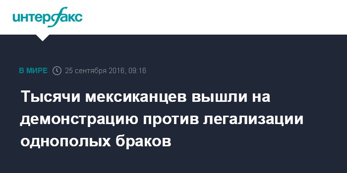 Москва. 25 сентября. INTERFAX.RU - Несколько тысяч человек в столице Мексики Мехико вышли на акцию протеста в ответ на предложение правительства легализовать однополые браки, сообщает "Би-би-си".