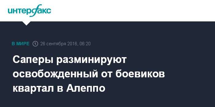 Москва. 26 сентября. INTERFAX.RU - Сирийские саперы в Алеппо обследуют жилые кварталы района Рамуси, который был освобожден сирийской армией три недели назад и в котором отступающие боевики оставили множество мин.