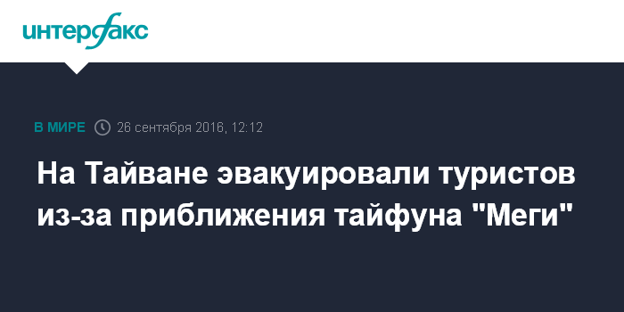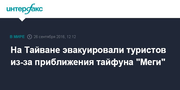 Москва. 26 сентября. INTERFAX.RU - Власти острова Тайвань эвакуировали несколько тысяч туристов в связи с приближающимся тайфуном "Меги", который станет уже третьим по счету за последние две недели, сообщают в понедельник западные СМИ.