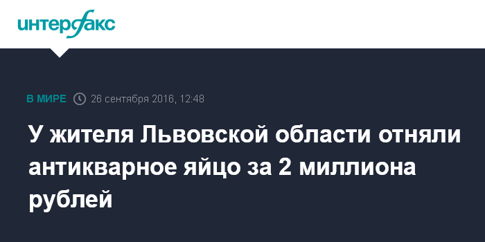 Москва. 26 сентября. INTERFAX.RU - Антикварное яйцо стоимостью 750 тысяч гривен (около 1,85 миллиона рублей) неизвестный силой отнял у жителя районного центра Яворов в ночь на 25 сентября во Львове.