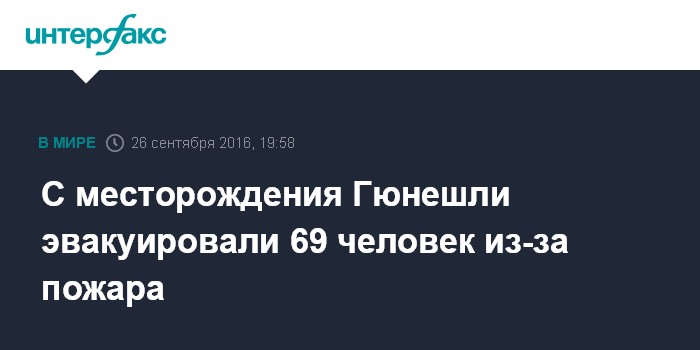 Москва. 26 сентября. INTERFAX.RU - Спасатели МЧС Азербайджана к вечеру понедельника эвакуировали 69 человек с морского основания №19 на месторождении Гюнешли, где вспыхнул пожар, говорится в совместном заявлении компании SOCAR и МЧС.