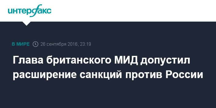 Москва. 26 сентября. INTERFAX.RU - В Лондоне не исключают возможности усиления санкций в отношении России из-за ситуации в Сирии, сообщил в понедельник в эфире британского телеканала Sky news глава британского внешнеполитического ведомства Борис Джонсон.