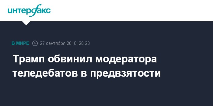 Москва. 27 сентября. INTERFAX.RU - Кандидат на пост президента США от Республиканской партии Дональд Трамп заявил, что модератор теледебатов и ведущий телеканала NBC Лестер Холт явно отдавал предпочтение кандидату от демократов экс-госсекретарю Хиллари Клинтон, сообщает британская телерадиокорпорация "Би-би-си".