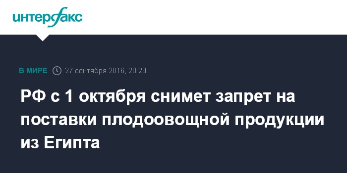 Москва. 27 сентября. INTERFAX.RU - Россия с 1 октября снимает запрет на поставки плодоовощной продукции из Египта, сообщил "Интерфаксу" руководитель Россельхознадзора Сергей Данкверт.