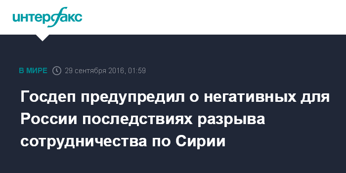 Москва. 29 сентября. INTERFAX.RU - Возможное прекращение сотрудничества между Вашингтоном и Москвой по Сирии может оказать отрицательное влияние на Россию, считают во внешнеполитическом ведомстве США.