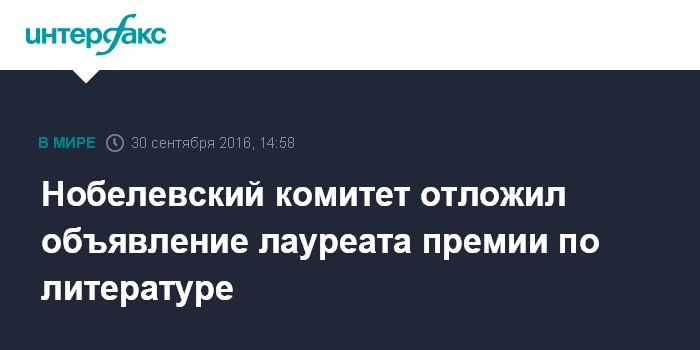 Москва. 30 сентября. INTERFAX.RU - Имя лауреата Нобелевской премии по литературе 2016 года станет известно 13 октября, сообщает в пятницу агентство Associated Press со ссылкой на члена Нобелевского комитета Пера Вестберга.