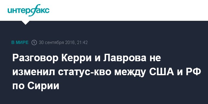 Москва. 30 сентября. INTERFAX.RU - Сотрудничество между США и РФ по Сирии осталось на прежнем уровне по итогам переговоров госсекретаря США Джона Керри и главы МИД РФ Сергея Лаврова в пятницу, заявил на брифинге представитель госдепа США Марк Тонер.