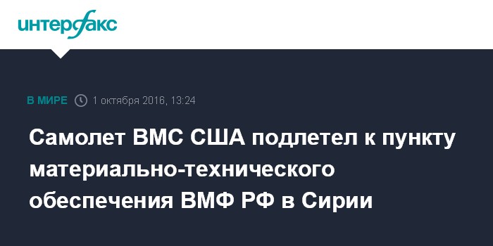 Москва. 1 октября. INTERFAX.RU - Патрульный противолодочный самолет ВМС США, совершающий в субботу разведывательный полет в восточной части акватории Средиземного моря, приблизился к пункту материально-технического обеспечения ВМФ России в сирийском порту Тартус, свидетельствуют данные западных сайтов, отслеживающих передвижения военной авиации.