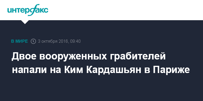 Москва. 3 октября. INTERFAX.RU - Двое вооруженных мужчин напали на американскую телезвезду Ким Кардашьян в парижском отеле, сообщает CNN со ссылкой на заявление ее представителя.