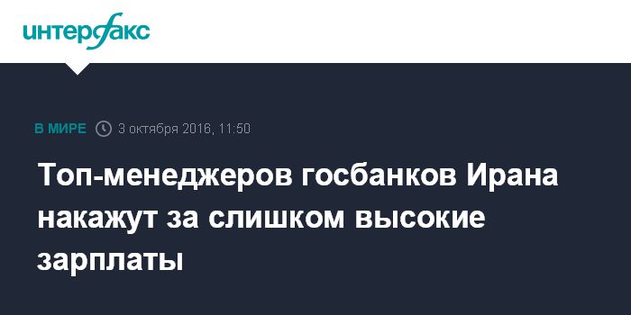 Москва. 3 октября. INTERFAX.RU - Власти Ирана сообщили, что почти 400 высокопоставленных работников банковского сектора будут наказаны за непомерно высокие зарплаты.