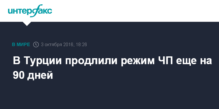 Москва. 3 октября. INTERFAX.RU - Власти Турции приняли решение продлить еще на три месяца режим ЧП, объявленный в связи с неудачной попыткой военного переворота в июле 2016 года, сообщает агентство The Associated Press со ссылкой на заявление вице-премьера Турции Нумана Куртулмуша.