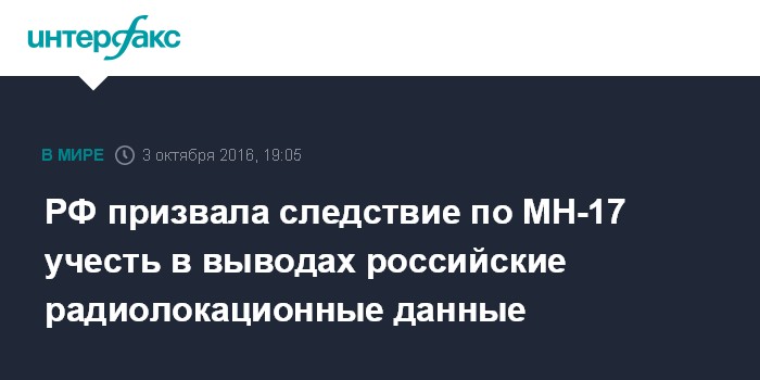 Москва. 3 октября. INTERFAX.RU - Москва призвала Гаагу учесть в окончательных выводах по катастрофе МН-17 переданные российской стороной радиолокационные данные.