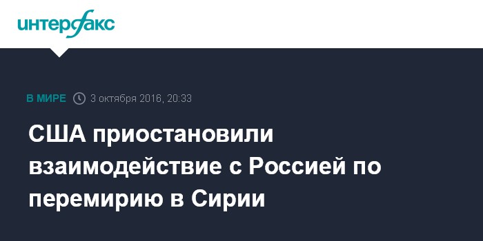 Москва. 3 октября. INTERFAX.RU - США заявили о приостановке взаимодействия с Россией по вопросу соблюдения перемирия в Сирии и подчеркнули, что это было непростым решением.