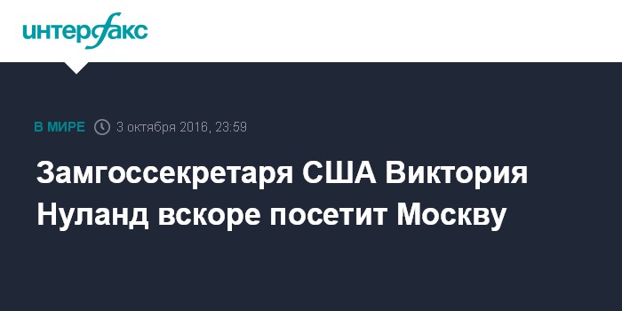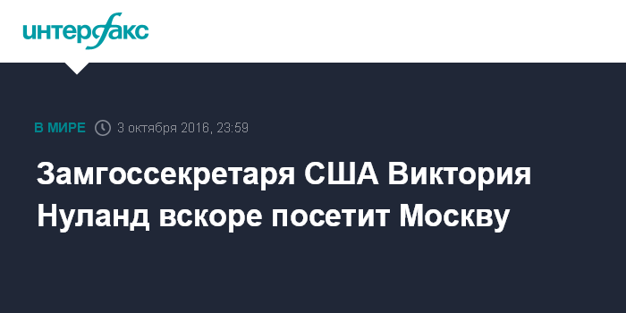 Москва. 3 октября. INTERFAX.RU - Замгоссекретаря США Виктория Нуланд, как ожидается, в ближайшие дни посетит Москву, сообщает Госдепартамент США.