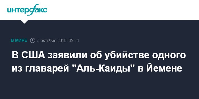 Москва. 5 октября. INTERFAX.RU - Один из руководителей "Аль-Каиды" был убит, а другой ранен в результате авиаудара в провинции Байда в Йемене американскими военными 29 сентября, сообщает Reuters со ссылкой на главное командование США.