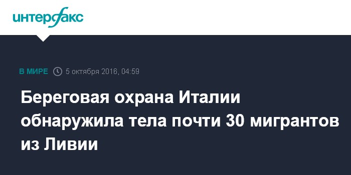 Москва. 5 октября. INTERFAX.RU - По меньшей мере, 28 тел ливийских мигрантов, пытавшихся пробраться в Европу, обнаружила во вторник береговая охрана Италии, сообщают СМИ.