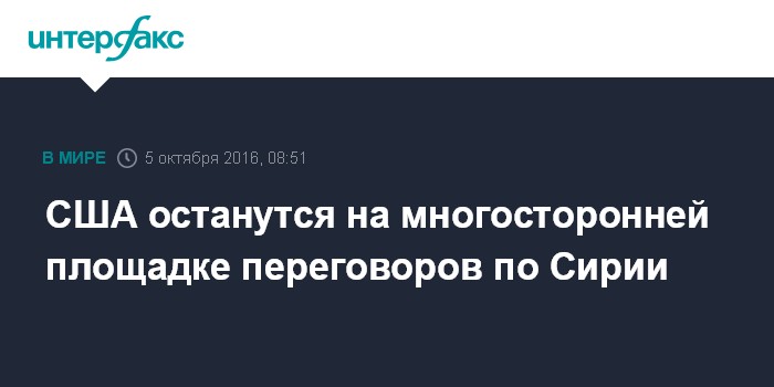 Москва. 5 октября. INTERFAX.RU - Госсекретарь США Джон Керри заявил, что его страна не собирается уходить с многосторонней площадки по урегулированию в Сирии, продолжает верить в политическое решение сирийского конфликта и будет работать над созданием условий, которые позволят возобновить переговоры между сирийскими сторонами.