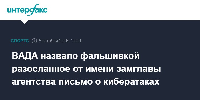 "На прошлой неделе ВАДА была проинформирована некоторыми пользователями системы АДАМС о получении писем по электронной почте якобы от имени заместителя гендиректора ВАДА Роба Келера, в которых говорилось, что президент ВАДА хотел бы обсудить с ними ситуацию с кибератаками. Чтобы внести ясность, мы заявляем, что заместитель генерального директора не посылал никаких писем, и призываем быть бдительными, чтобы не пострадать от аферистов", - говорится в сообщении ВАДА.