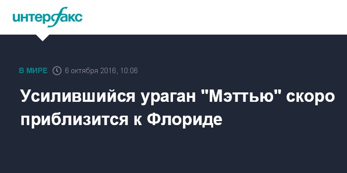 Москва. 6 октября. INTERFAX.RU - Ураган "Мэттью" приближается к американскому штату Флорида, усилившись до четвертой категории опасности, сообщило в четверг агентство Associated Press.