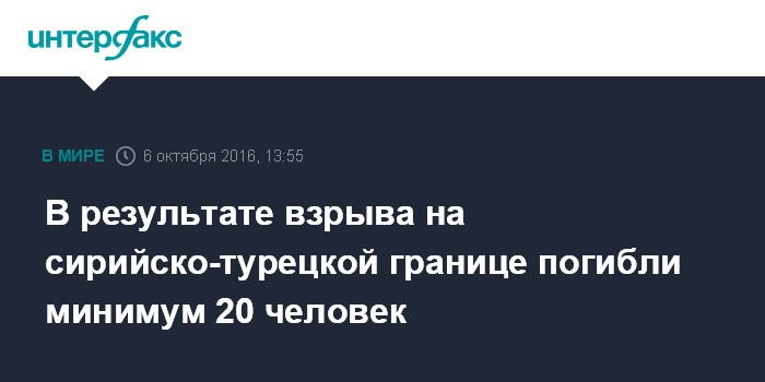 Москва. 6 октября. INTERFAX.RU - Не менее 20 человек погибли в результате взрыва, произошедшего в четверг в населенном пункте Атме в Сирии на границе с Турцией, сообщает агентство The Associated Press.