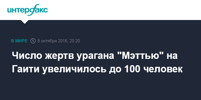 Москва. 6 октября. INTERFAX.RU - Число погибших на Гаити в результате удара мощного урагана "Мэттью" достигло, по меньшей мере, 100 человек, сообщает в четверг "Би-би-си".