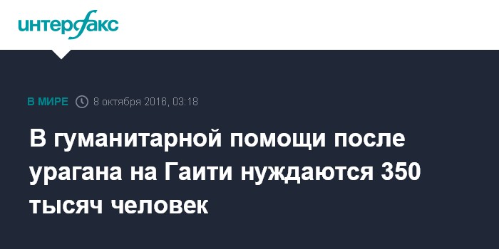 Москва. 8 октября. INTERFAX.RU - В срочной гуманитарной помощи нуждаются около 350 тысяч жителей Гаити, пострадавших в результате удара урагана "Мэттью", сообщает центр новостей ООН.