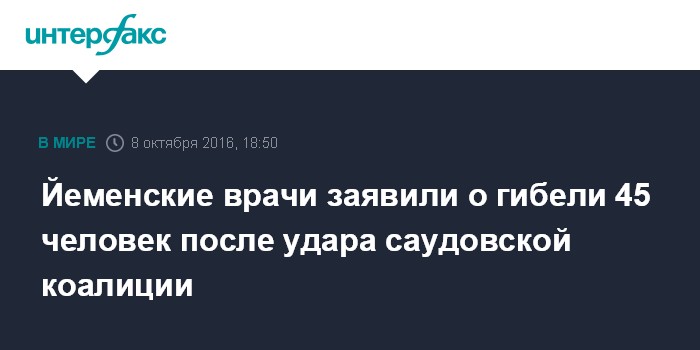 Москва. 8 октября. INTERFAX.RU - Йеменские службы безопасности и медики заявили, что по меньшей мере 45 человек погибли в результате авиаудара коалиции, возглавляемой Саудовской Аравией. Как сообщает Associated Press со ссылкой на источник, еще 100 человек были ранены.