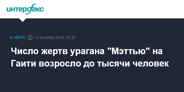 Москва. 10 октября. INTERFAX.RU - Число погибших в результате мощного урагана "Мэттью" на Гаити увеличилось до 1 тыс. человек, сообщают в понедельник западные СМИ.
