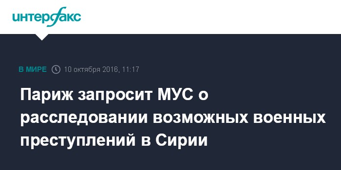 Москва. 10 октября. INTERFAX.RU - Глава МИД Франции Жан-Марк Эро заявил в понедельник, что Париж готовит обращение в Международный уголовный суд (МУС) для консультаций о расследовании возможных военных преступлений, совершенных в Сирии.