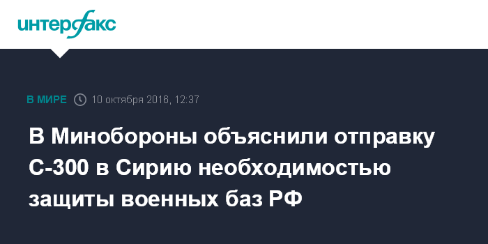 Москва. 10 октября. INTERFAX.RU - Основное назначение зенитной ракетной системы С-300 в Сирии - защита российских военных баз, сообщил статс-секретарь - замминистра обороны Николай Панков.