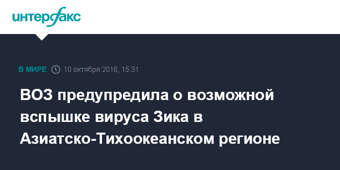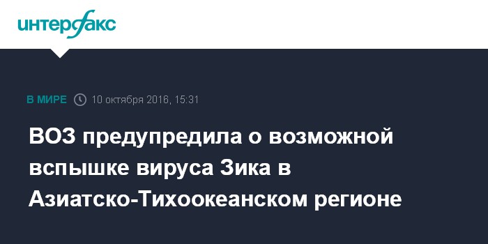 Москва. 10 октября. INTERFAX.RU - Вирус Зика может в дальнейшем распространиться по всему Азиатско-Тихоокеанскому региону, сообщили в понедельник Всемирная организация здравоохранения (ВОЗ).
