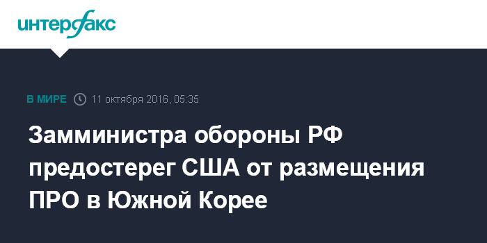 Москва. 11 октября. INTERFAX.RU - Решение разместить в Южной Корее комплексы противоракетной обороны (ПРО) THAAD, недавно принятое Вашингтоном, чревато обострением региональной напряженности, созданием дополнительных препятствий для урегулирования всего комплекса проблем Корейского полуострова, заявил замминистра обороны РФ Анатолий Антонов.