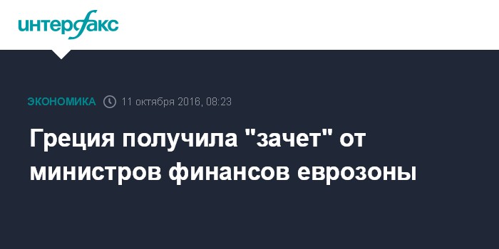 Москва. 11 октября. INTERFAX.RU - Министры финансов стран-членов еврозоны дали позитивную оценку выполнению Грецией программы реформ и согласились выделить Афинам часть очередного кредитного транша.
