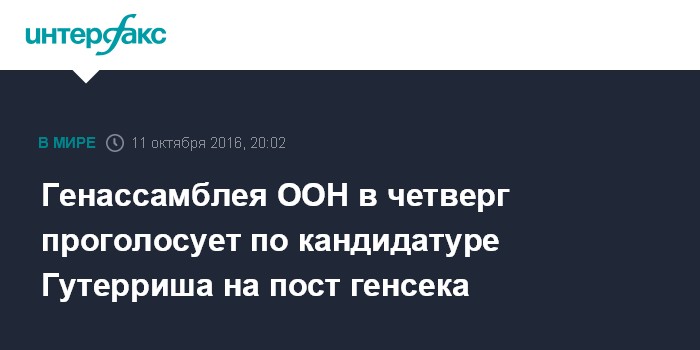 Москва. 11 октября. INTERFAX.RU - В Генассамблее ООН подтвердили, что проведут в четверг голосование по утверждению португальца Антониу Гутерриша на пост генсека ООН, сообщает в среду агентство EFE.