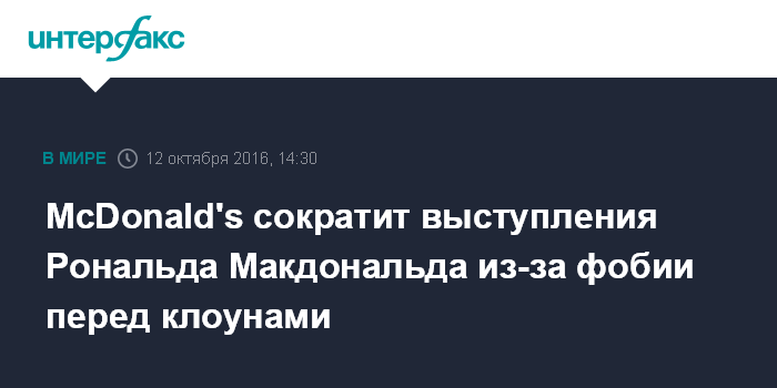 Москва. 12 октября. INTERFAX.RU - Сеть фастфуда McDonald's обещала ограничить число мероприятий, в которых будет участвовать ее символ, клоун Рональд Макдональд, из-за фобии перед страшными клоунами. Об этом сообщает "Би-би-си".