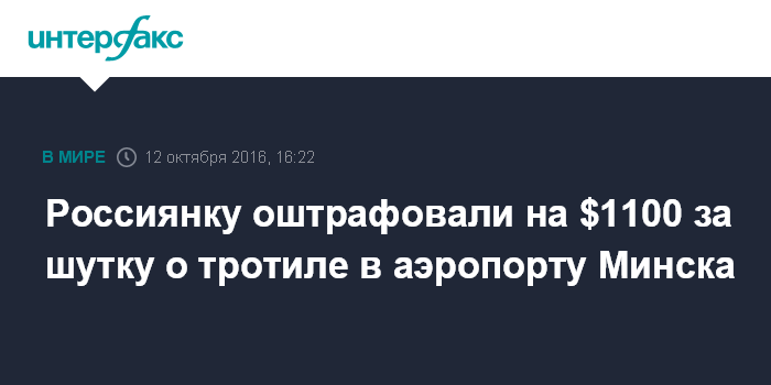 Москва. 12 октября. INTERFAX.RU - Суд Октябрьского района Минска признал пошутившую о тротиле в своей сумке россиянку Марию Рымарь виновной в заведомо ложном сообщении об опасности и назначил ей наказание в виде штрафа.