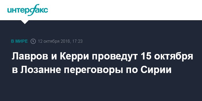 Москва. 12 октября. INTERFAX.RU - Встреча по Сирии глав внешнеполитических ведомств России и США Сергея Лаврова и Джона Керри, а также ключевых стран региона состоится 15 октября в Лозанне.