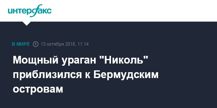 Москва. 13 октября. INTERFAX.RU - Ураган "Николь", сформировавшийся над Атлантическим океаном, постепенно усиливается и движется в сторону Бермудских островов, сообщает в четверг американский телеканал ABC.