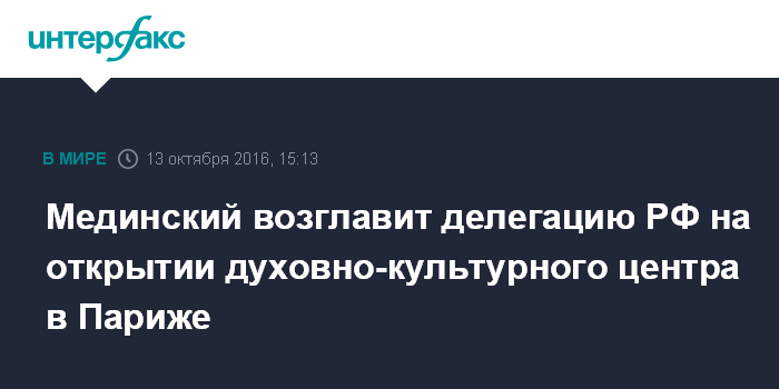 Москва. 13 октября. INTERFAX.RU - Министр культуры РФ Владимир Мединский возглавит российскую делегацию на открытии духовно-культурного центра в Париже, сообщили "Интерфаксу" в пресс-службе ведомства в среду.