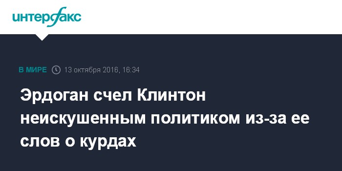 Москва. 13 октября. INTERFAX.RU - Лидер Турции Реджеп Тайип Эрдоган считает, что политической неискушенностью кандидата в президенты США Хиллари Клинтон можно объяснить ее предложение поставлять оружие сирийским курдам, которые воюют против "Исламского государства" (запрещено в РФ).