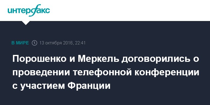 Москва. 13 октября. INTERFAX.RU - Президент Украины Петр Порошенко и канцлер Германии Ангела Меркель договорились о проведении трехсторонней телефонной конференции в формате "Украина-Германия-Франция" в ближайшие дни.